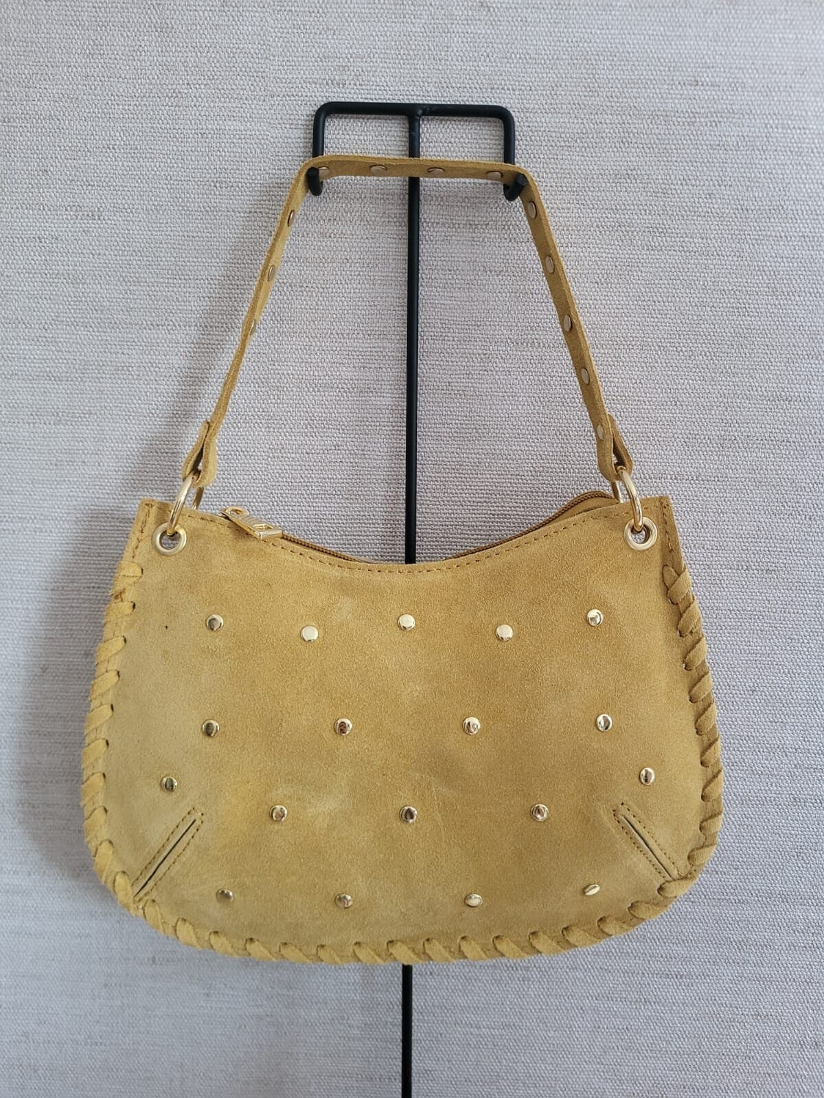 De goudkleurige studs en handgestikte details zorgen voor een luxe en trendy uitstraling. Dankzij het compacte, maar praktische formaat is deze tas perfect voor dagelijks gebruik én een avondje uit. Bevat zowel een korte als lang hengsel. De tas bevat ook een rits.