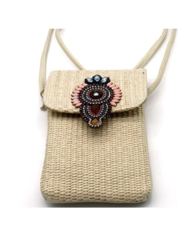 Deze stijlvolle crossbody tas combineert natuurlijke eenvoud met een vleugje artistieke flair. Gemaakt van gevlochten materiaal in een neutrale zandkleur en afgewerkt met een opvallende handgemaakte kralenapplicatie op de flap, straalt deze tas rust én karakter uit.