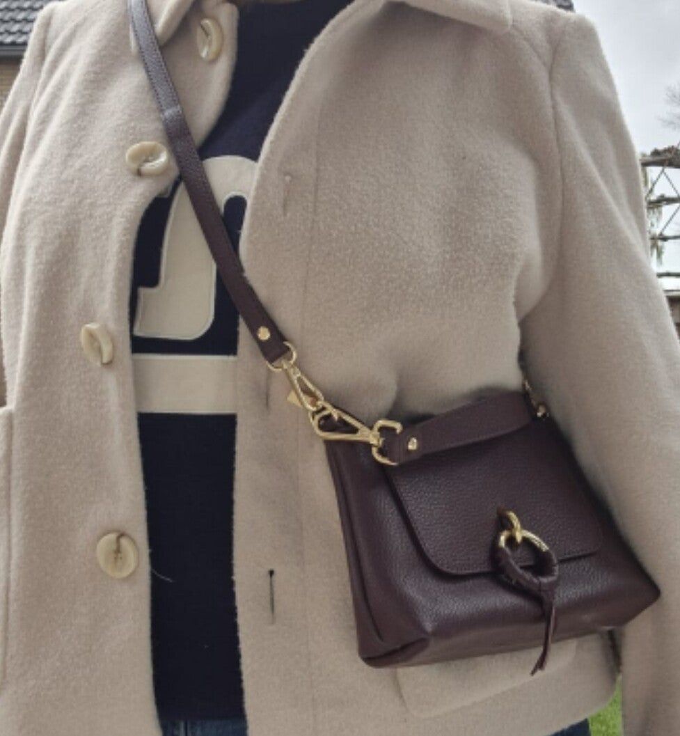 Je kunt de tas zowel in de hand als crossbody dragen.