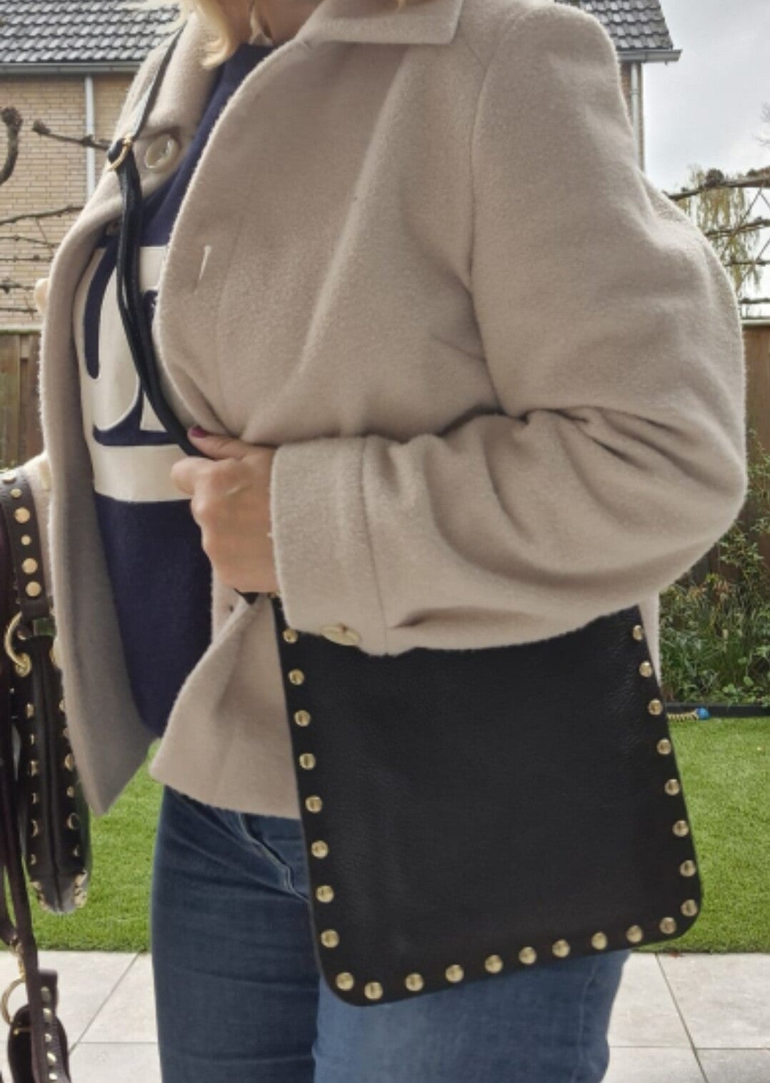 Zoek je een tas waar veel in kan? Dan is dit de tas dat je zoekt. Een zwarte vierkante leren tas en met gouden studs.